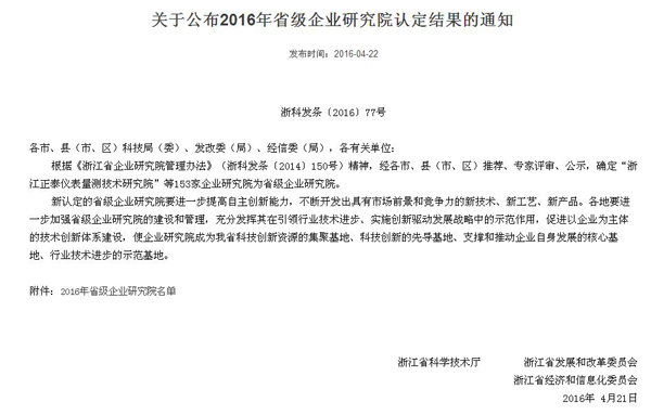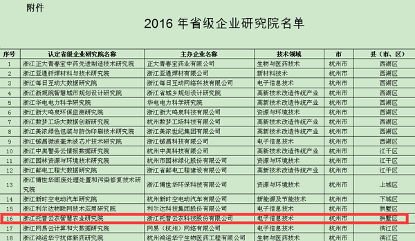 4月22日,浙江省科技廳公布了2016年“省級企業研究院”名單,經省內各市、縣(市、區)推薦、專家評審、公示,確定“托普云農智慧農業研究院”等153家企業研究院為省級企業研究院。