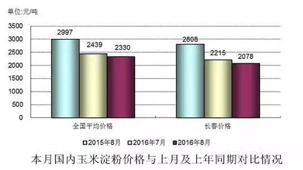 2016年7-8月份國內淀粉價格先跌后漲,總體仍呈下跌趨勢。8月份全國淀粉平均價格為2330元/噸,環比下降108元/噸,降幅4.45%;同比下降667元/噸,降幅22.25%。其中,長春地區淀粉出廠價格為2078元/噸,環比下跌137元/噸,降幅6.18%;同比下降730元/噸,降幅25.99%。