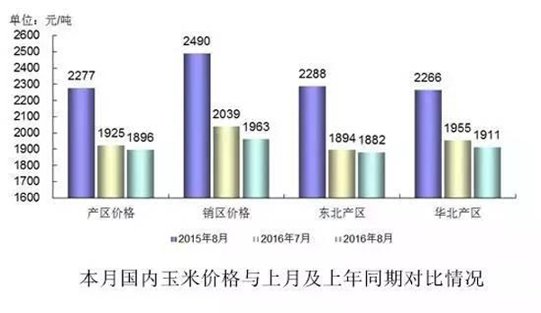 2016年8月份,我國玉米產區平均價格1896元/噸,比上月下降28元/噸,降幅1.48%;同比下降381元/噸,降幅16.73%。其中,東北產區價格為1882元/噸,環比下降12元/噸,降幅0.66%,同比下降407元/噸,降幅17.77%;華北黃淮產區價格為1911元/噸,環比下降44元/噸,降幅2.27%,同比下降355元/噸,降幅15.68%;國內銷區玉米價格為1963元/噸,環比下降76元/噸,降幅3.75 %,同比下降527元/噸,降幅21.18%(圖)。