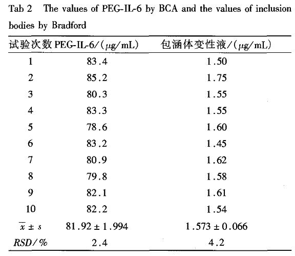 對Lowry法測得的IL-6樣品濃度為250 μg/mL,加入PEG修飾后再用BCA法測得的該樣品的濃度為246 μg/mL,說明PEG對BCA法沒有影響。對BCA法測定的包涵體變性液中蛋白濃度為25 mg/mL的樣品用Bradford法測得只有1.59 mg/mL,對照試驗顯示包涵體變性液中的β一巰基乙醇嚴重干擾BCA法,而對Bradford法無影響。由此可見,Bradford法適于檢測包涵體變性液。表2是連續(xù)10次對同一PEG-IL-6樣品用BCA法測定和同一包涵體變性液樣品用Bradford法測定的結(jié)果。