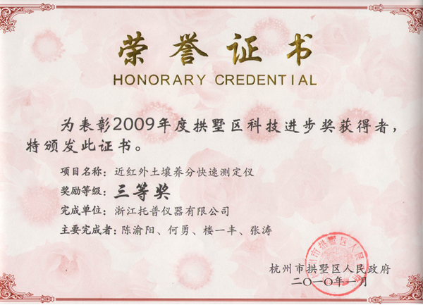 下圖是近紅外土壤養分快速測定儀被評為拱墅區科學技術進步獎三等獎。