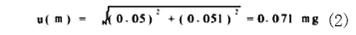 1.2 樣品稱量的標(biāo)準(zhǔn)不確定度u(m)的分析稱量不確定度來自兩方面。第一,稱量的變動(dòng)性在50g 以內(nèi),稱量的變動(dòng)性通過10次重復(fù)測(cè)定統(tǒng)計(jì),標(biāo)準(zhǔn)偏差為0.05mg。第二,天平校正產(chǎn)生的不確定度,按檢驗(yàn)證書給定的± 0.1mg,在置信概率95%(k=196)時(shí),換算成標(biāo)準(zhǔn)偏差為:0.1/1.96=0.051,此兩項(xiàng)得出稱量的不確定度為: