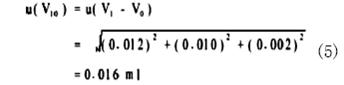 用鹽酸標(biāo)準(zhǔn)溶液滴定樣品和試劑空白是在10mL 滴定管中進(jìn)行的。10mL 滴定管的標(biāo)準(zhǔn)不確定度來源為:第一,滴定管體積的不確定度,按檢定證書給定為± 0.02mL,按均勻分布換算成標(biāo)準(zhǔn)偏差為0.02/ √ 3=0.012mL。第二,充滿液體至滴定管刻度的變動(dòng)性,通過重復(fù)6 次測(cè)定統(tǒng)計(jì), 標(biāo)準(zhǔn)偏差為0 . 0 1 0m L 。第三,滴定管和溶液的溫度與校正溫度不同引起的體積變化的不確定度,假設(shè)差為2℃,對(duì)水體積膨脹系數(shù)為2.1 × 10-4/℃,則95% 置信概率(k=1.96)時(shí)體積變化的區(qū)間為± 10 × 2 × 2.1 × 10-4=0.004mL,換算成標(biāo)準(zhǔn)偏差為0.004/1.96=0.002mL,以上三項(xiàng)合成得出的不確定度為: