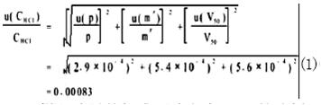 1.1 鹽酸標(biāo)準(zhǔn)溶液的相對(duì)標(biāo)準(zhǔn)不確定度u(CHCL)/CHCL 的分析鹽酸標(biāo)準(zhǔn)溶液的不確定度來自三方面:第一,標(biāo)定鹽酸用基準(zhǔn)無機(jī)碳酸鈉純度為100%± 0.05%,按均勻分布轉(zhuǎn)換成標(biāo)準(zhǔn)偏差為0.0005/ √ 3=0.00029,u(p)/p=2.9 × 10-4。第二,基準(zhǔn)稱量的變動(dòng)性,在50g 以內(nèi)稱量的變動(dòng)性通過10 次重復(fù)測(cè)定統(tǒng)計(jì),標(biāo)準(zhǔn)偏差為0.05mg,天平校正產(chǎn)生的不確定度,按檢驗(yàn)證書給定的± 0.1mg,在置信概率95%(k=1.96)時(shí),換算成標(biāo)準(zhǔn)偏差為0.1/1.96=0.051,即u ( m’) / m ’= 5 . 4 × 1 0 -4。第三,5 0 m L 滴定管的不確定度按檢驗(yàn)證書給定的± 0.04mL,按均勻分布換算標(biāo)準(zhǔn)偏差為0.04/ √ 3=0.023mL,充滿液體至滴定管刻度的變動(dòng)性通過重復(fù)6次測(cè)定統(tǒng)計(jì),標(biāo)準(zhǔn)偏差為0.012mL,滴定管與溶液溫度校正時(shí)溫度不同引起的體積不確定度,假設(shè)差為2℃,對(duì)水體積膨脹系數(shù)為2.1 × 10-4/℃,則95% 置信概率(k=1.96)時(shí)體積變化的區(qū)間為± 50 × 2 × 2.1 × 10-4= ± 0.021 mL,轉(zhuǎn)換成標(biāo)偏差為0.021/1.96=0.011。u(V50)/V50=5.6 × 10-4。根據(jù)以上三項(xiàng)得出的鹽酸標(biāo)準(zhǔn)溶液的相對(duì)標(biāo)準(zhǔn)不確定度為: