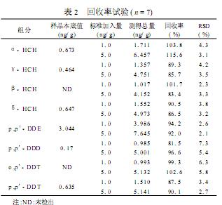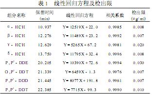 2. 1 線性范圍與檢出限 用正己烷將100μg/ ml 的儲備液分別稀釋成不同質量濃度的標準溶液進行實驗,并繪制標準曲線,試驗結果表明,被測組分質量濃度在0. 01~5. 00μg/ ml的范圍內與其色譜峰面積呈線性關系。HCH 和DDT 8 種組分的線性回歸方程、相關系數及方法檢出限(S/ N = 3) 見表1