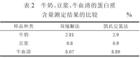 4.2 在牛奶、豆漿、牛血清中的對比實驗結果見表2。從表2 可以看出, 利用雙縮脲法測定牛奶、豆汁、牛血清蛋白質含量與凱氏法測定結果較為接近, 因為這些樣品中所含蛋白質溶解度較高,所含蛋白質種類相對較少, 其性質與標準蛋白液接近。