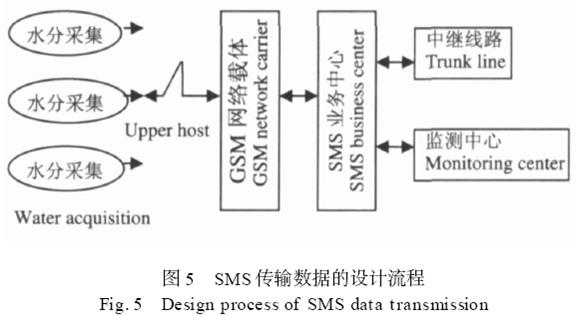 SMS(Short Messaging Service) 短消息業務是GSM 網的一項增值業務,通過控制信道傳輸數據,支持點對點消息業務及消息廣播業務等多種方式。水分采集的數據通過GSM 網全部發送到短消息業務中心,監控中心通過中繼線路DDN (Digital Data Network) 從短消息業務中心獲取數據 。