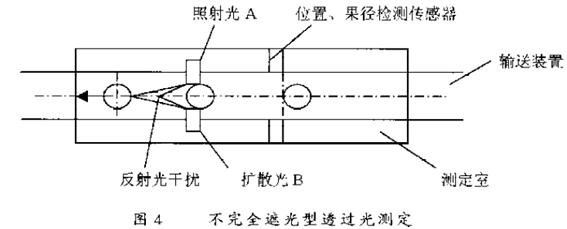 不完全遮光式透過光測定法測試原理如圖4 所示。近紅外線A 照射在果實表面上,透過果實內部的擴散光B 由設置在另一側的感光傳感器檢測。該方法是反射式的改進,由于照射光和感光傳感器設置在果實的兩側,減少了表面反射光對感光傳感器的影響。工作時,照射光連續定常照射,位于光軸上的感光傳感器用電子快門控制,僅當果實在適當位置時才檢測。前部設置有果徑檢測傳感器,果實經過其間時遮斷光源,根據前部開始遮光和后部結束遮光的時間差求出果徑,并判斷出果實的中心,計算機以該中心位置為基準,確定開始、結束測定時刻,在該時間間隔內進行數次頻譜測定,然后用平均值進行內部品質分析。
