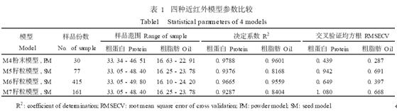 近紅外檢測模型建模樣品集樣品數(shù)量分別為30、77、415和161個(表1) 。其中,粉末模型樣品覆蓋范圍相對較窄,粗蛋白決定系數(shù)0. 9788,粗脂肪決定系數(shù)0. 9601,在4個模型中最大,交叉驗證均方根分別為粗蛋白0. 439,粗脂肪0. 287,在4個模型中最小。籽粒模型M6的樣品集中包括415份樣品,且粗蛋白和粗脂肪含量的樣品范圍在4個模型中最寬。它的粗蛋白和粗脂肪決定系數(shù)在3個籽粒模型中最大,交叉驗證均方根在3 個籽粒模型中最小。