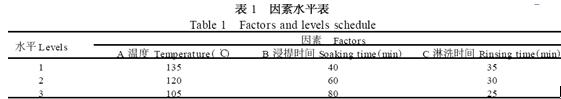 1. 4 正交設(shè)計提取方法 根據(jù)熱浸提—油重法測定原理,選定浸提溫度(A) 、浸提時間(B) 和淋洗時間(C) 作為考察因素,各設(shè)3 個水平,選用L9 (34 ) 正交表進行試驗(見表1) ,三次重復(fù)。