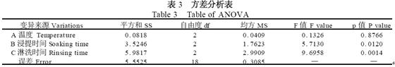 對粗脂肪含量數(shù)據(jù)進行直觀分析(表2) ,比較3個因素的極差( R) ,可見RC(1 . 1219) > RB