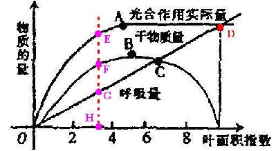 OAD:OA段,隨葉面積指數的增加,光合作用實際量增加;過A點以后,隨葉面積指數的增加,光合作用實際量不再增加并為一定值。