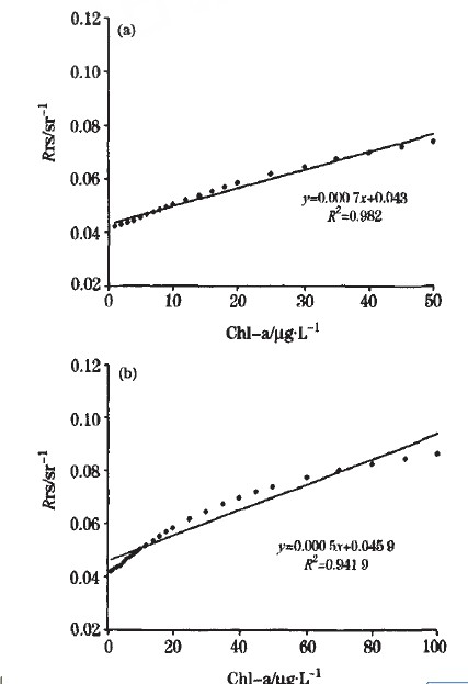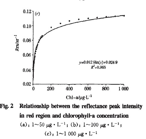 由圖2(a)可知,葉綠素在紅波段的反射峰強度同濃度有較好的線件相關性,其決定系數達0.982,利用葉綠素濃度同反射峰強度的相關關系,進行葉綠素濃度的反演,有較好的反演效果,其RMSE為1.944 ug·L-1。但是當葉綠素濃度達到10ug·L-1時,這種線性相關關系逐漸減弱[圖2(b)],當葉綠素濃度達到l 000ug·L-1時,紅波段反射峰強度和葉綠素濃度則呈現較好的對數關系[圖2(c)],決定系數達0.965。