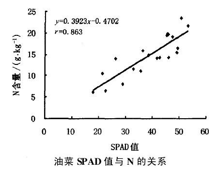油菜葉片的SPAD值和N含量呈線性關系,擬合后r為0·862,則SPAD值與N的數學關系模型可用以下式子來表示:y=0.3923x-0.4702