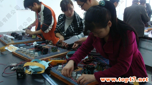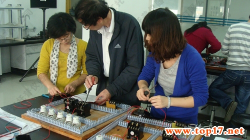 圖為:電工培訓(xùn)現(xiàn)場(chǎng)學(xué)員在老師的指導(dǎo)下親自動(dòng)手做實(shí)驗(yàn)