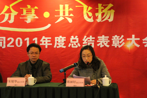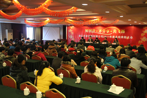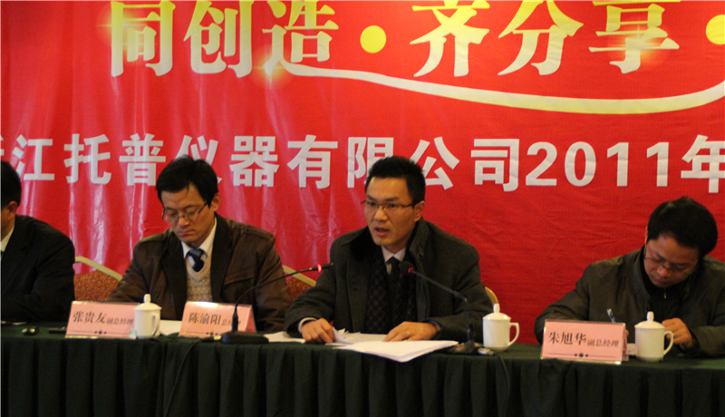浙江托普儀器有限公司2011年年度總結(jié)表彰大會于2012年1月15日在銘泰大酒店七樓會議室圓滿召開。此次會議的主題是“同創(chuàng)造  齊分享  共飛揚”,托普上下110余人齊聚一堂,共同回顧2011年托普儀器的點點滴滴,并對2012年各項工作進行展望。