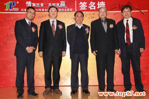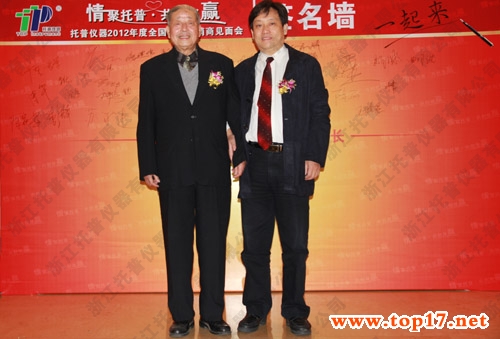 圖為:陳子元院士與高祥照處長在托普經(jīng)銷商見面會(huì)簽名墻前合影留念