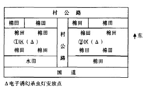 在鄒城街龍橋村選擇地勢平坦、水源方便、土壤肥力好、交通便利的連片棉田二處,面積共13.33hm²,每處6. 67hm²,將16瓦燈管各12瓦燈管的兩盞電源誘幻殺蟲燈分別懸吊放于這兩處棉田內(nèi),吊裝16瓦燈的6. 67hm²棉田簡稱1區(qū),吊裝12瓦的燈的6. 67hm²棉田簡稱2區(qū),每盞幻燈離地1.5m,燈距50m,開展誘殺害蟲實(shí)驗(yàn),詳見幻燈安裝及實(shí)驗(yàn)分區(qū)位置圖。