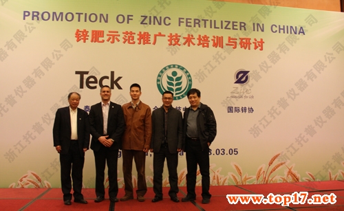 圖為:全國農技推廣中心杭大鵬書記(中間)、全國農技推廣中心節水處高祥照處長(右一)、加拿大泰克資源安德魯·格林教授(左二)、國際鋅協會樊明憲教授(左一)、浙江托普儀器有限公司陳渝陽董事長(右二)合影留念
