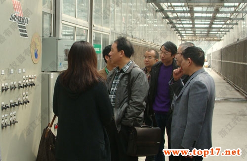圖為:托普工作人員詳細(xì)講解托普物聯(lián)網(wǎng)系統(tǒng)的控制原理,左一為傳化陳堅總經(jīng)理,左二為戴守勤處長,右一為傳化榮松主任