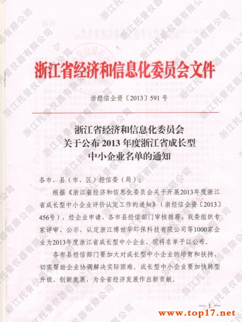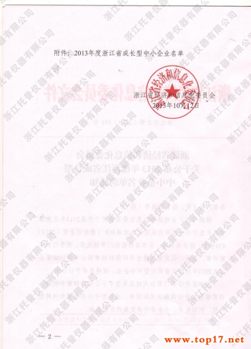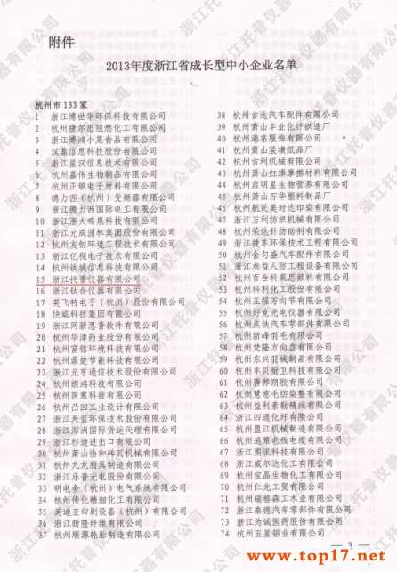 圖為:2013年度浙江省成長型中小企業(yè)名單(托普儀器在第十五位紅線處)