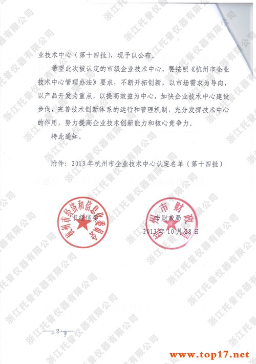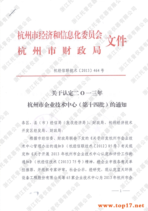 經企業申報各有關單位推薦,并組織專家評審、社會公示、經杭州市經信委和財政局研究認定浙江托普儀器有限公司等65家企業技術中心為2013年杭州市企業技術中心(第十四批)。