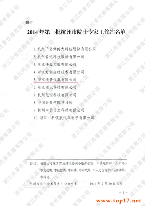 日前,《關于認定2014年第一批杭州市院士專家工作站的通知》頒發,認定托普儀器在內的10家單位院士專家工作站為2014年第一批杭州市院士專家工作站。