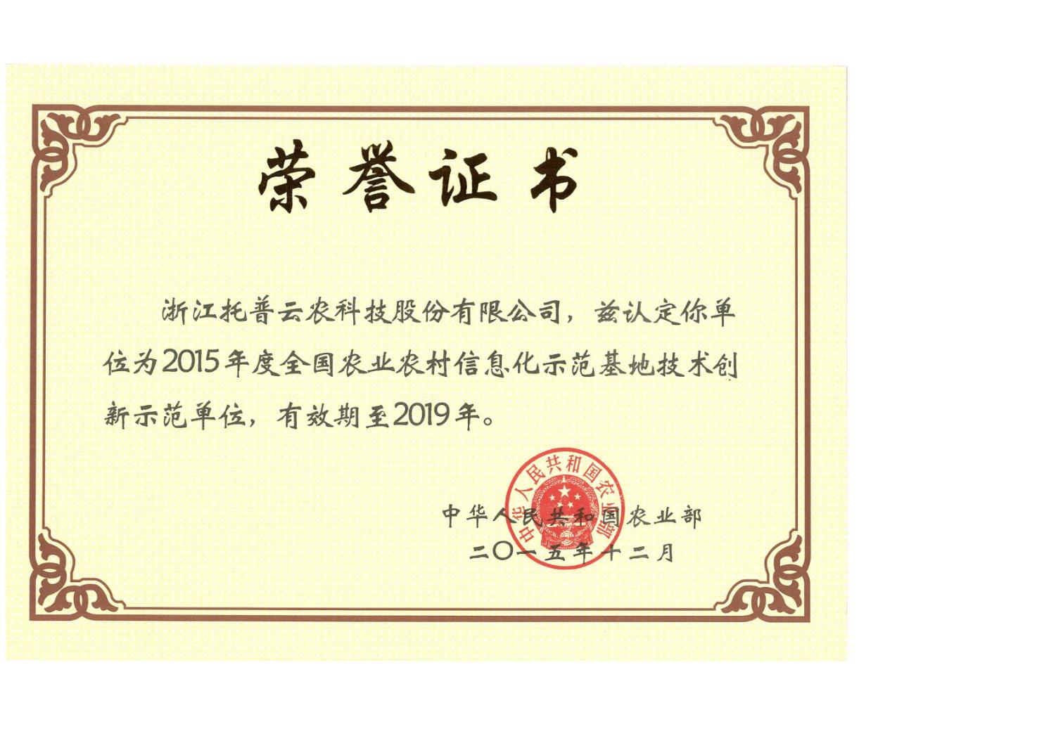 2015年12月9日,農(nóng)業(yè)部發(fā)文公布《農(nóng)業(yè)部關(guān)于認定2015年度全國農(nóng)業(yè)農(nóng)村信息化示范基地的通知》,浙江托普云農(nóng)科技股份有限公司獲批技術(shù)創(chuàng)新型示范單位!锻ㄖ芬蟾魇痉痘,秉持創(chuàng)新、協(xié)調(diào)、綠色、開放、共享的發(fā)展理念,積極推進“互聯(lián)網(wǎng)+”現(xiàn)代農(nóng)業(yè)行動,大力發(fā)展農(nóng)業(yè),切實抓好農(nóng)業(yè)電子商務(wù)、農(nóng)業(yè)物聯(lián)網(wǎng)、農(nóng)業(yè)農(nóng)村大數(shù)據(jù)、農(nóng)業(yè)信息服務(wù)等重點工作,大膽探索創(chuàng)新,充分發(fā)揮示范引領(lǐng)作用,為推進農(nóng)業(yè)現(xiàn)代化作出新貢獻。